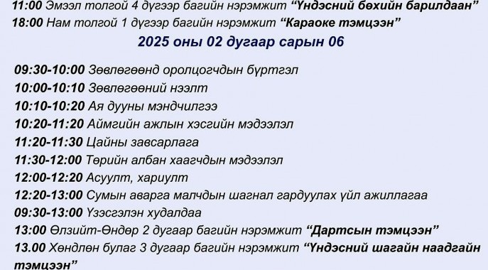 Эмээл толгой 4 дүгээр багийн нэрэмжит "Үндэсний бөх"-ийн барилдаан, Нам толгой 1 дүгээр багийн нэрэмжит "Караоке" тэмцээний удирдамж...
