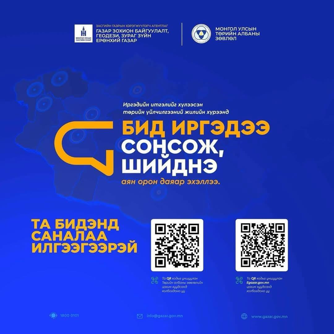 “Бид иргэдээ сонсож, шийднэ” аяны хүрээнд ГАЗРЫН ХАРИЛЦААТАЙ холбоотой асуудлаар иргэдэд зөвлөгөө, мэдээлэл өгөх, иргэдийн санал хүсэлтийг авах нээлттэй хаалганы өдөрлөгийг 2025 оны 05 дугаар сарын 13-ны өдөр 10:00 цагаас сумын "Иргэний танхим"-д зохион байгуулах тул иргэд та бүхнийг ирж үйлчлүүлэхийг урьж байна.